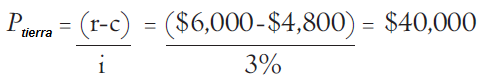El valor del alquiler de la tierra – es la renta r – se puede aproximar utilizando el precio de compra de la tierra sin impuestos propiedad P y la tasa de interés vigente i , o el precio de compra del terreno con impuesto a la propiedad P tax (vamos a suponer un precio de $ 150.000) junto con latasa de interés i y la tasa de impuesto a la propiedad t (vamos a suponer una tasa de impuesto a la propiedad del 1 por ciento). Este